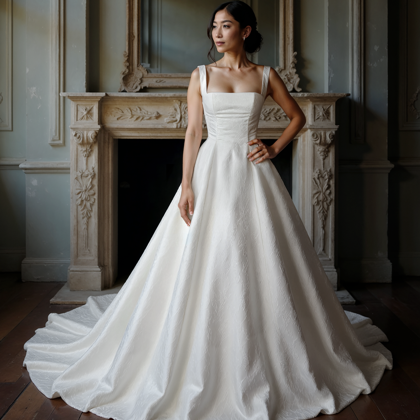 Materials are carefully selected for their appearance, movement, and structure. Distinctive elements such as hand-applied beading, detachable trains, and meticulously finished interiors reflect a considered approach to design.