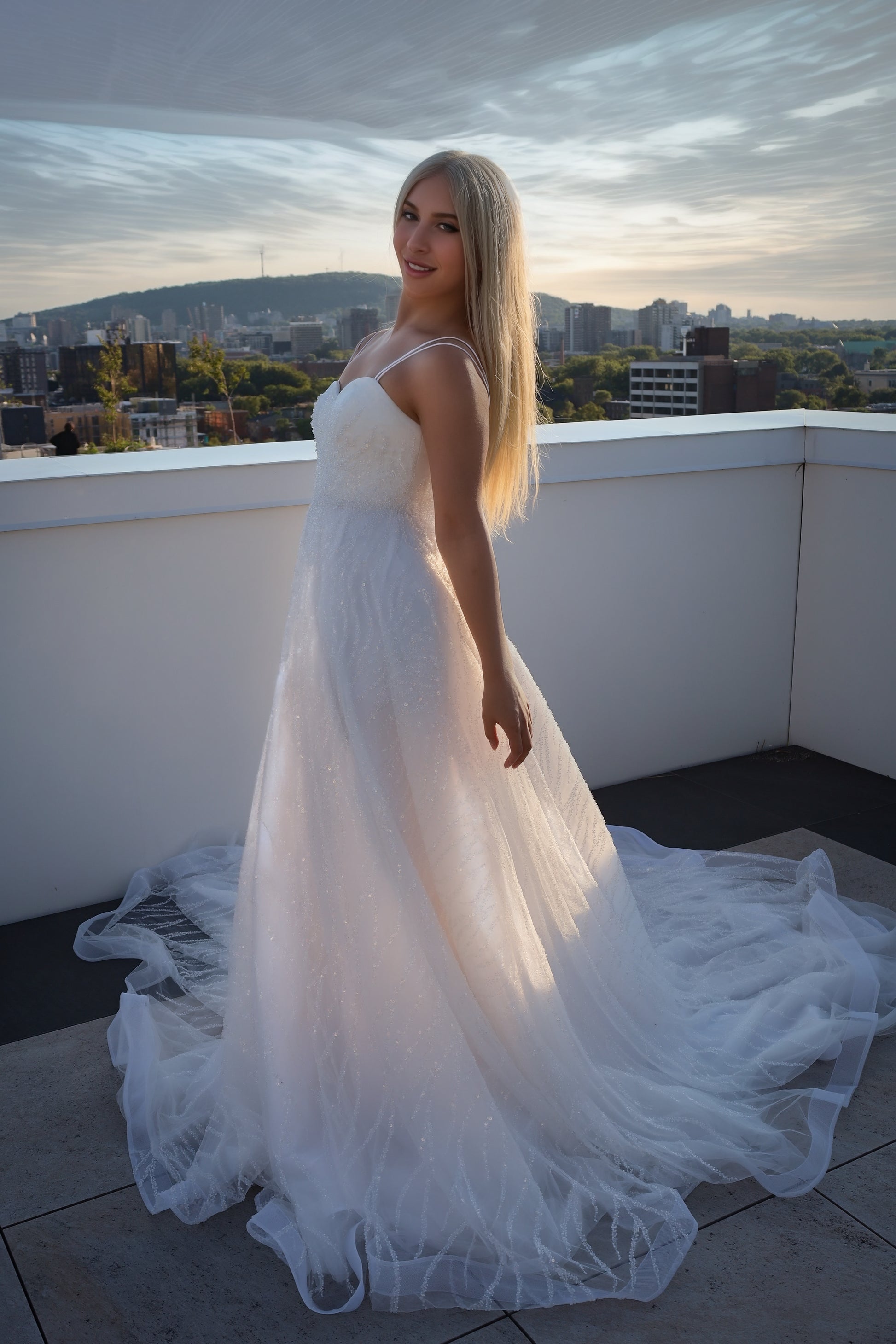 Rayhana features impeccable beaded stripwork, a crystal‐topped double‐strap bodice, and a sweeping long train.