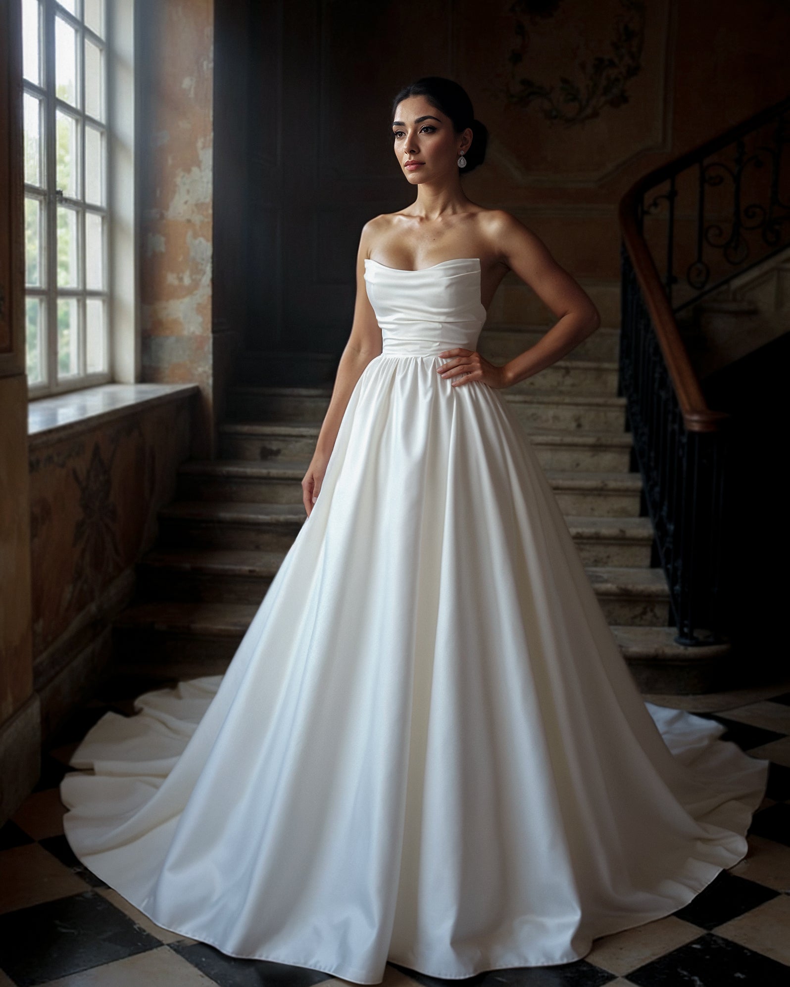 Draped matte satin, a soft puffy skirt, and a long clean train.